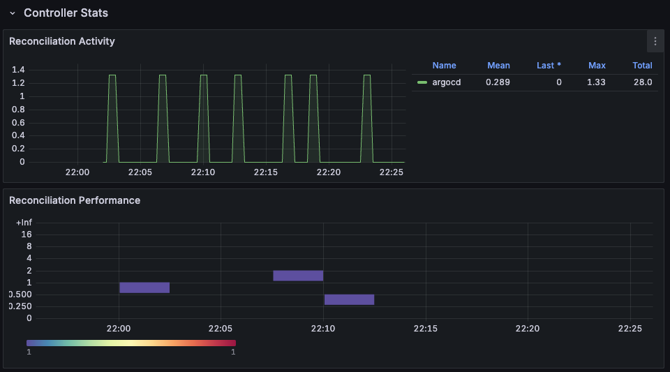 - Diff 지연 시간 (argocd_app_reconcile_time): 이 시간이 길어진다는 것은 Git의 Desired State와 Live State를 비교하는 데 시간이 오래 걸린다는 의미입니다. 애플리케이션 수가 많거나 컨트롤러 리소스가 부족할 때 발생할 수 있습니다.