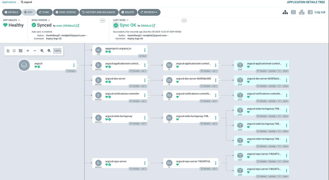 Application Controller : Git 상태와 클러스터 상태를 비교하고(Diff), 불일치 시 동기화(Sync)를 수행