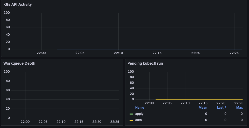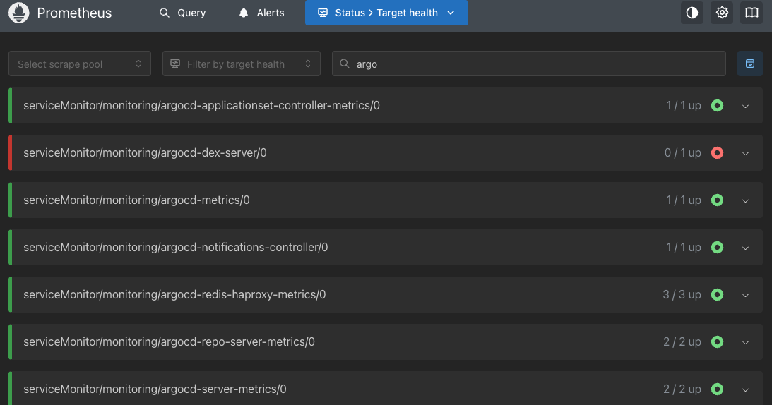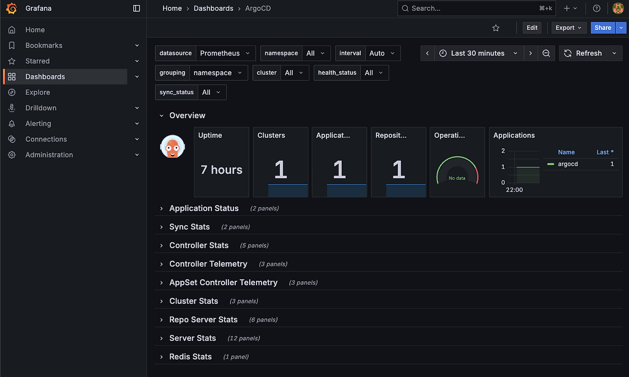 - API 지연 시간: argocd_request_duration_seconds의 P99(99th Percentile) 값이 높아지면, 사용자 경험(Web UI, CLI)이 저하되고 있음을 의미합니다. API 서버의 자원을 확장하거나 부하를 분산해야 할 수 있습니다.
