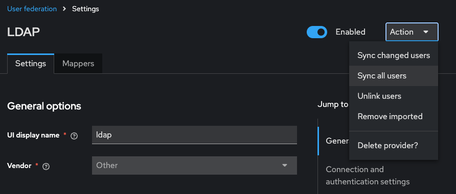 - Connection URL: ldap://openldap.openldap.svc:389 ⇒ Test connection