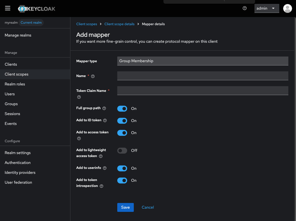 - Client Scopes 생성 : Name (groups) , 나머지는 기본값