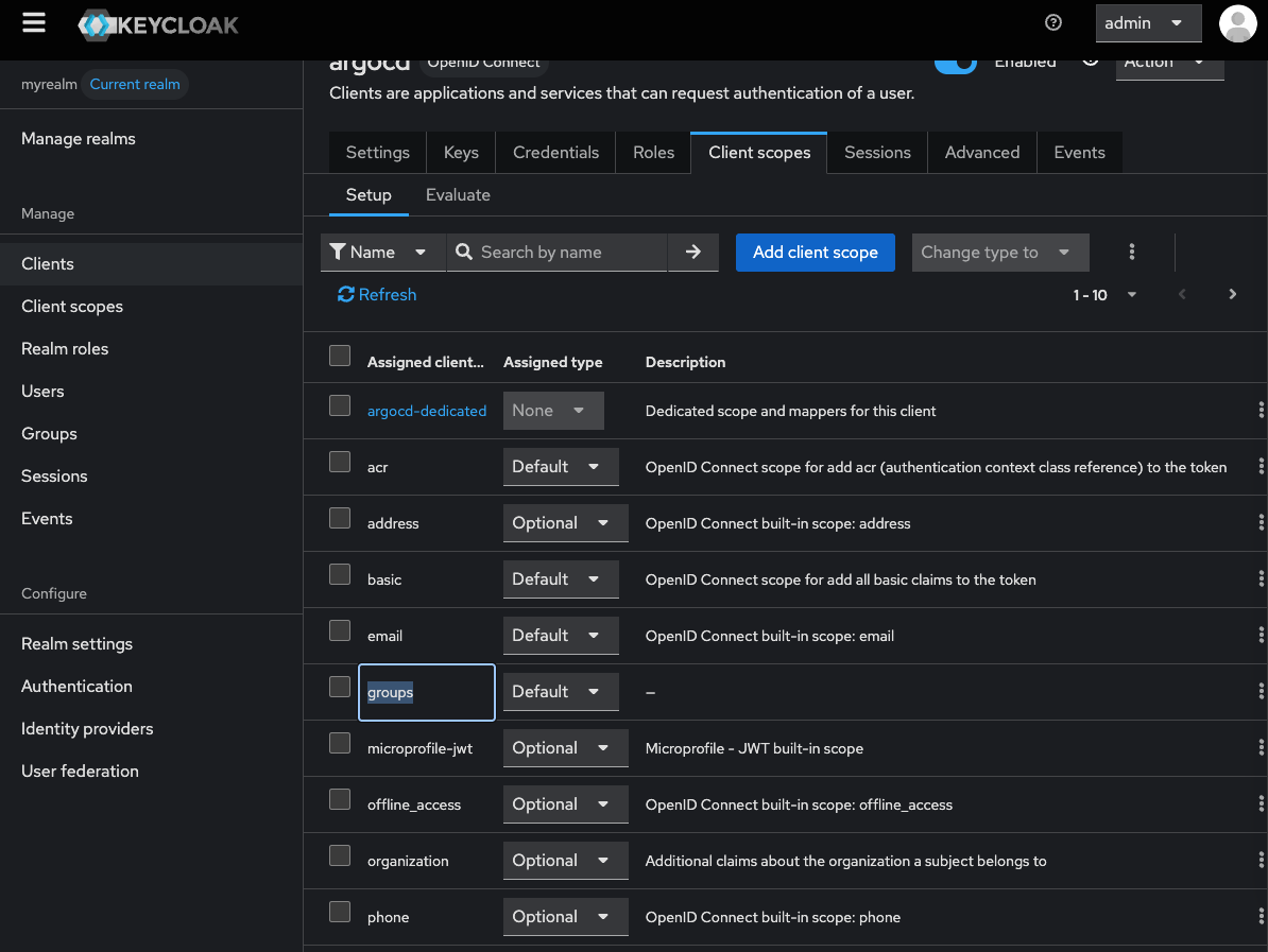 - argocd client 에서 groups 전달을 위한 설정 : Client 에서 argocd 클릭
