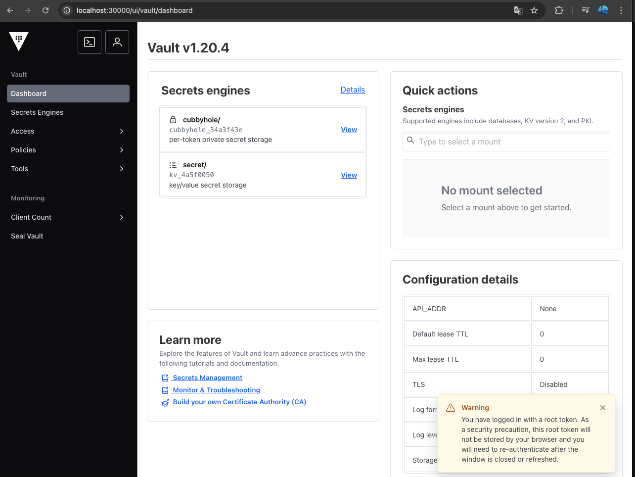 - Root Token: 초기 루트 토큰이 지정된 값(여기서는 root)으로 고정됩니다.