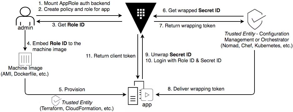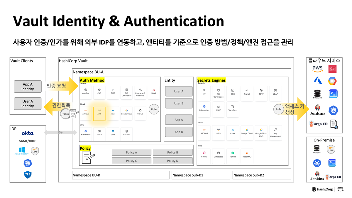 Vault에서는 인증/인가를 위해 외부 IDP를 연동하고, 엔티티를 기준으로 인증 방법/정책/엔진 접근을 관리합니다.